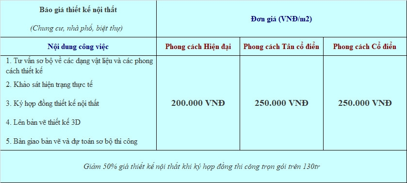 Bên cạnh đó, tùy vào đặc trưng cầu kỳ hay kiểu dáng đơn giản của mỗi phong cách thiết kế sẽ có sự khác nhau một chút về mức giá thiết kế nội thất. Nhưng, sự chênh lệch trong giá thiết kế nội thất sẽ không thành vấn đề khi Đo Interior GIẢM 50% phí thiết kế nếu bạn chọn thi công nội thất trọn gói.