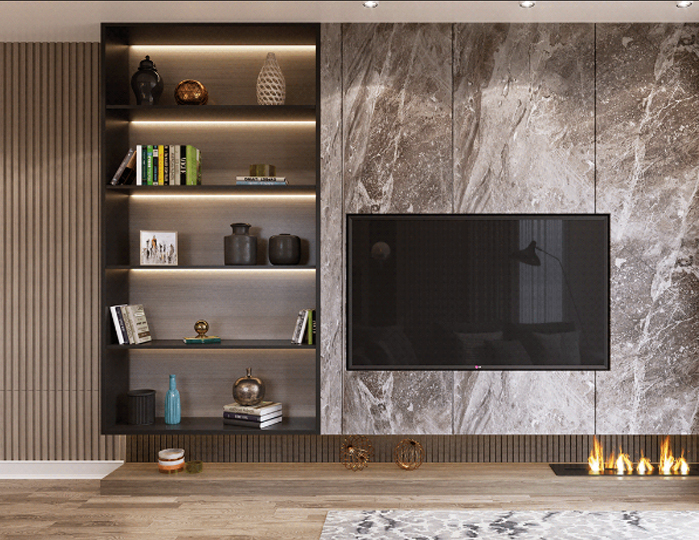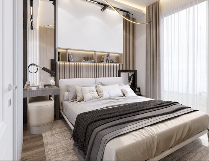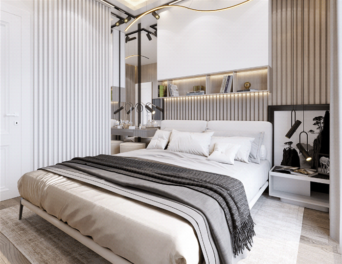 Phòng ngủ được thiết kế với kiểu dáng đơn giản, sử dụng tông màu trắng và xám để tạo ra sự tinh tế và thanh lịch. Tường được trang trí bằng các tấm gỗ hoặc đá trang trí để tạo nét độc đáo và thêm sự ấm cúng cho không gian. Giường ngủ được thiết kế theo kiểu dáng hiện đại, tích hợp tủ kệ giúp tối ưu hóa không gian sử dụng.