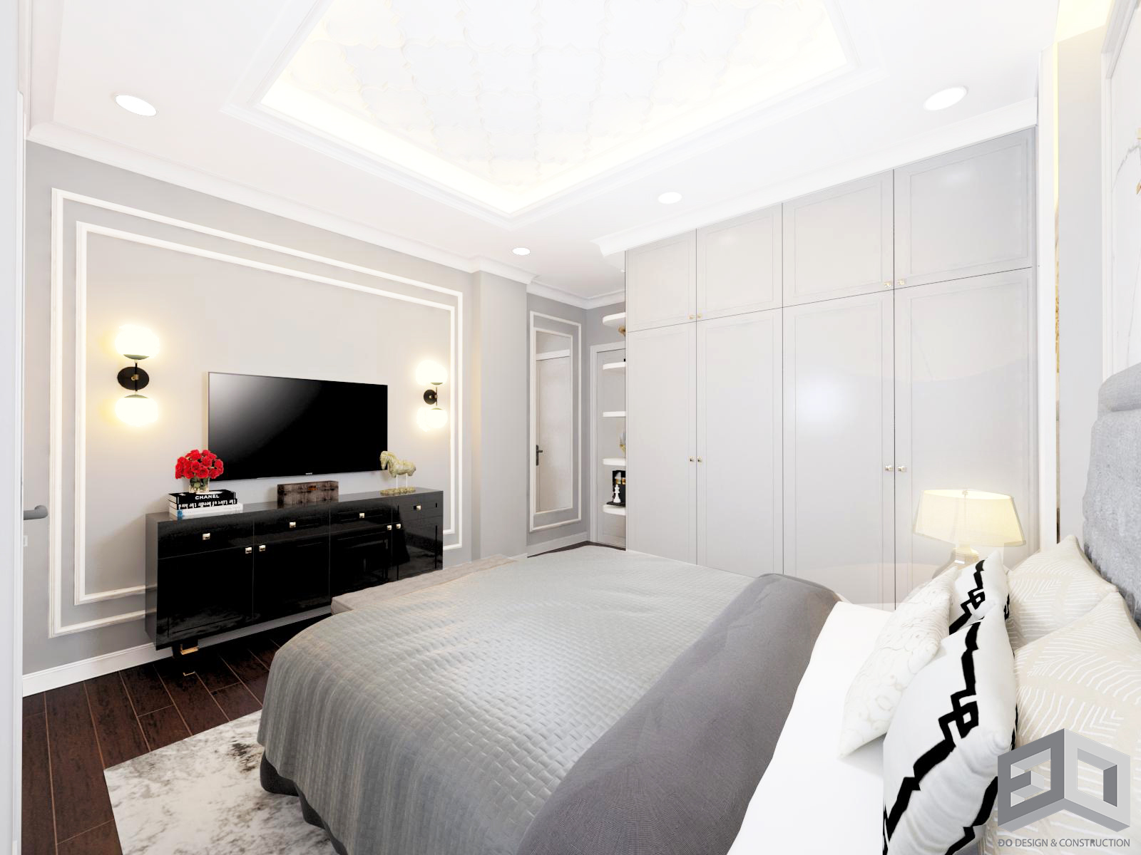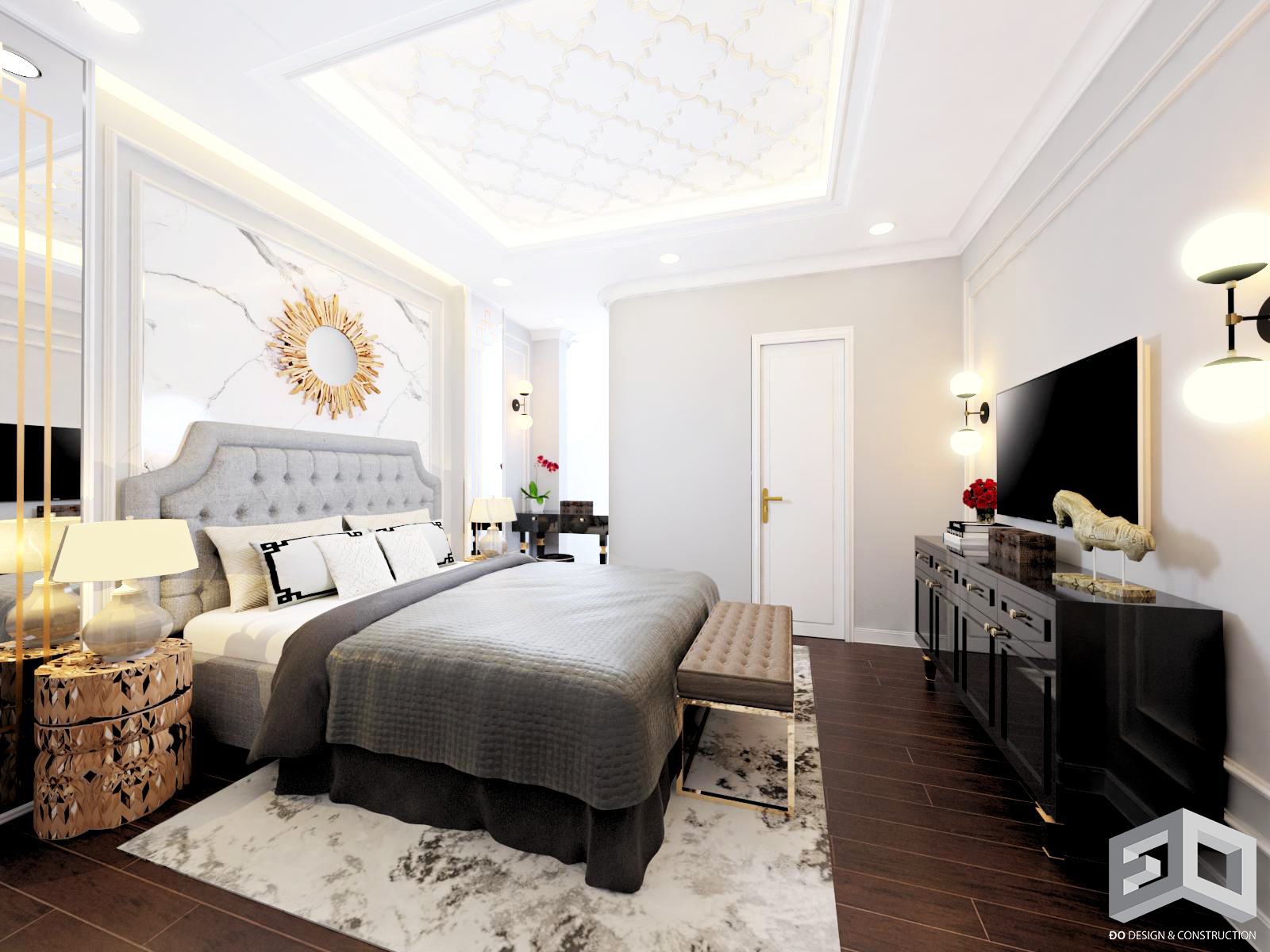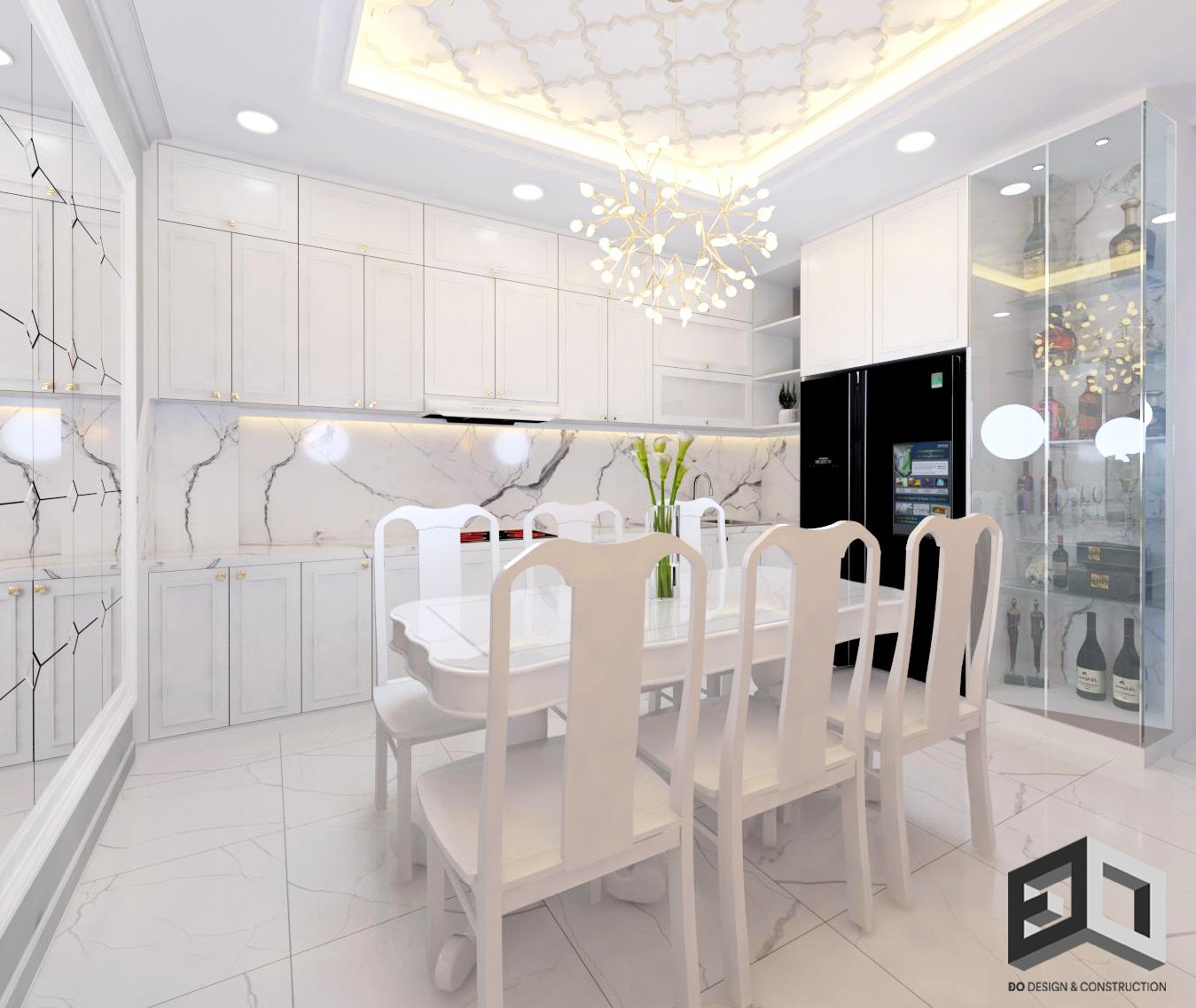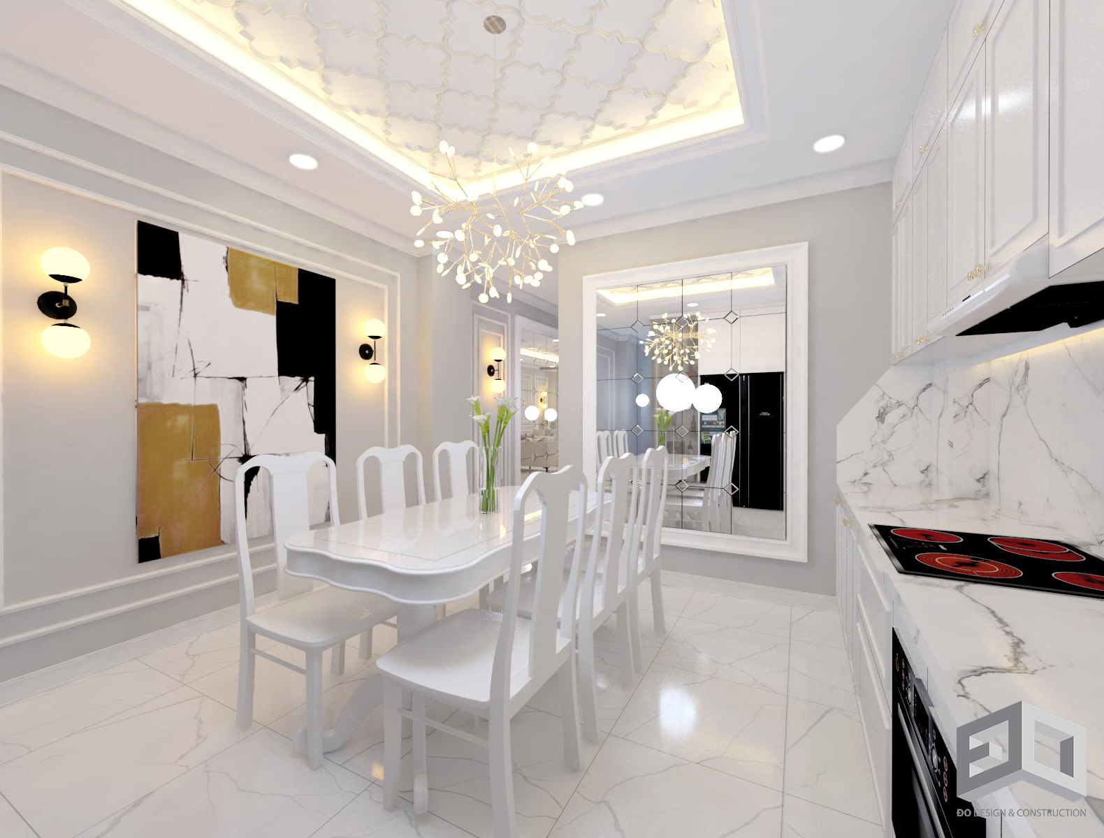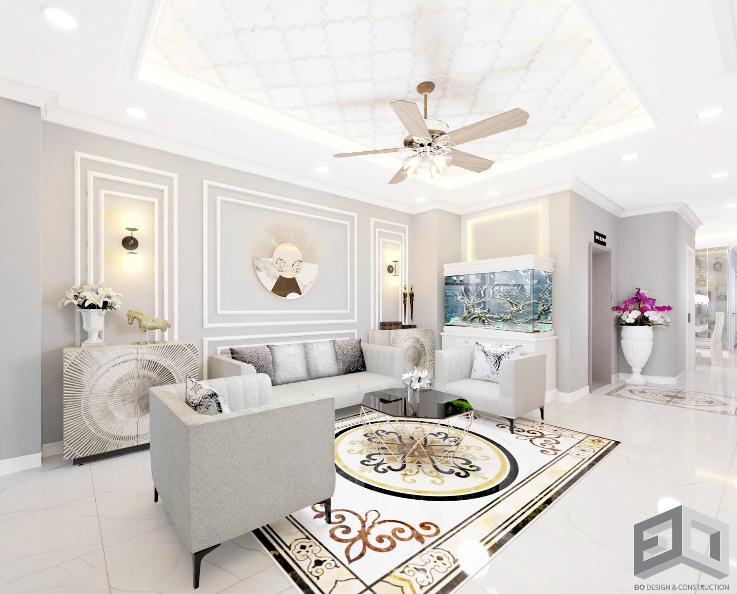Ở mẫu thiết kế biệt thự tân cổ điển này, toàn bộ màu sắc phào chỉ, phù điêu, màu tường đều được sơn màu trắng. Cổng biệt thự tân cổ điển được thiết kế nghệ thuật với những họa tiết hoa văn độc đáo. Xung quanh ngôi biệt thự đều được trồng cây xanh và hoa, ở mỗi lối cửa thông ra bên hông nhà biệt thự sẽ được thiết kế kết hợp với hồ nước nhỏ, hồ cá cảnh, hoặc ban công bàn trà.