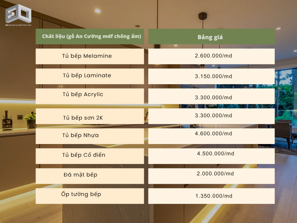 Dưới đây là đơn giá tủ bếp tại ĐO – Kính mời quý khách tham khảo!