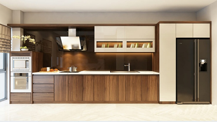 Đúng như tên gọi, tủ bếp chữ i được thiết kế có hình dạng giống như chữ “i” với một hệ tủ duy nhất được bố trí dọc theo một mặt tường thẳng tắp. Đây là kiểu dáng tủ bếp đơn giản, dễ ứng dụng nên có độ phổ biến cao. Đặc biệt thích hợp với những không gian nhà nhỏ, có diện tích khiêm tốn như: chung cư, nhà phố, nhà cấp 4,…